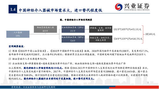 根据《2018年中国脑卒中防治报告》数据,2016年国内脑卒中患者数约1300万,复发率约17.1%,每年脑卒中新发病例约200万,且以每年8.3%增长。根据《2018-2022年中国神经介入支架系统行业市场供需调研咨询报告》显示,2017年,中国神经介入支架系统的市场需求量为20960套,进口量达14454套,进口量占需求量的比重为69.0%,预计2020年需求量达到31229套,根据目前国内主要神经介入耗材价格和进口比例推算,目前国内市场规模约30亿元。国内神经介入器械行业目前仍处于发展初期,进口替代空间巨大。预测国内神经介入市场空间大约193亿元。