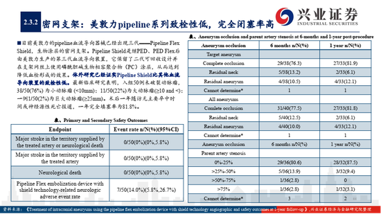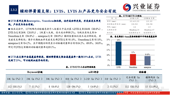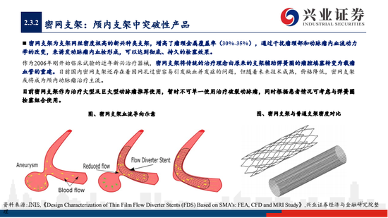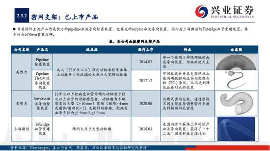 2)血流导向装置 (密网支架、覆膜支架)是治疗动脉瘤革命性产品,主流产品美敦力Pipeline已经研发至第三代,目前国产上市的只有微创的Tubridge,血流导向装置将囊内栓塞转向载瘤血管重建的治疗理念,在大型及巨大型动脉瘤等难治适应症上较弹簧圈栓塞具有显著优势;