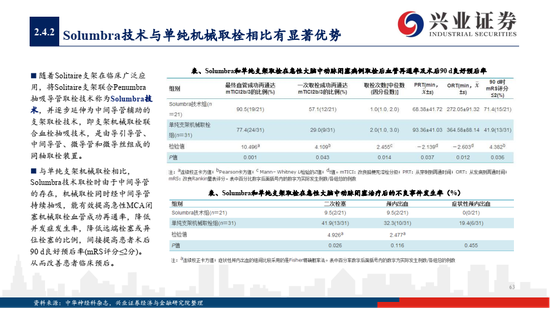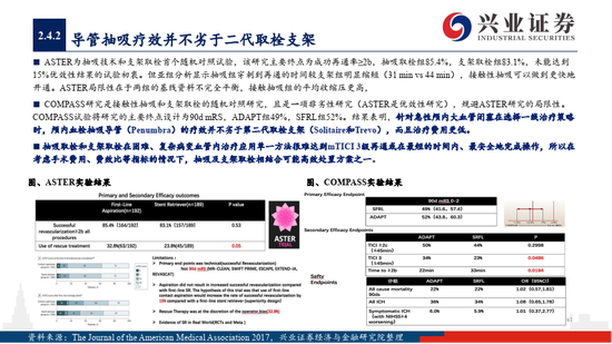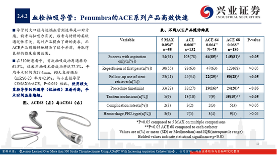 2)使用抽吸导管的ADAPT技术取栓,目前暂无国产品牌。抽吸取栓能够明显缩短取栓时间,提高完全再通率,市场发展潜力大,如何平衡抽吸力与远端血管到达率、提高首次再通率是研发关注重点;