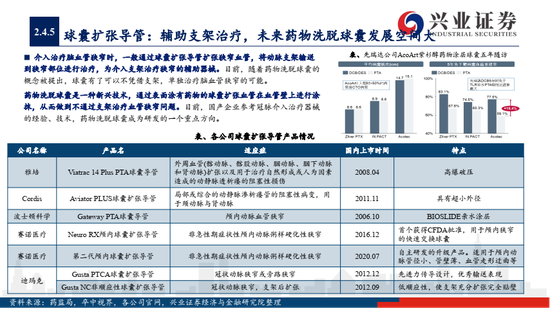 4)目前,国产企业参考冠脉介入器械的技术,药物洗脱球囊成为研发的一个重点方向,是未来有望达到不借助支架解决血管狭窄问题的新兴技术,通过扩张球囊达到均匀涂抹药物的目的。