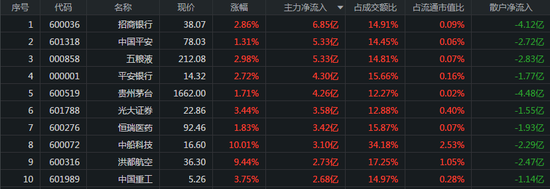 从个股来看,主力资金最青睐的3只股票分别是招商银行、中国平安、五粮液,流入金额分别为6.85亿元、5.33亿元、5.33亿元,所对应的涨幅分别为2.86%、1.31%、2.98%。