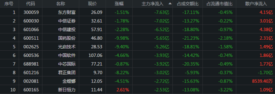 另外,被主力资金抛售的个股有东方财富、中信证券、中信建投,流出金额分别为7.63亿元、7.02亿元、6.52亿元。