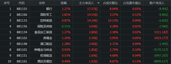 主力资金主要银行、军工、饮料制造三个板块,流入金额分别为17.57亿元、14.53亿元、14.24亿元,其中散户净流入金额为-8.90元、-9.86亿元、-6.60亿元。三个板块的涨幅分别为1.27%、1.81%、0.87%。