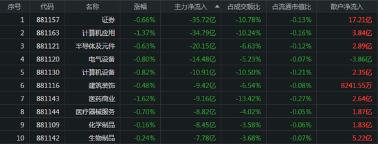 主力资金流出的板块分别是证券、计算机应用、半导体,主力资金流出金额分别为35.72亿元、34.79亿元、20.15亿元,其中散户净流入金额为17.21亿元、3.84亿元、2.89亿元。