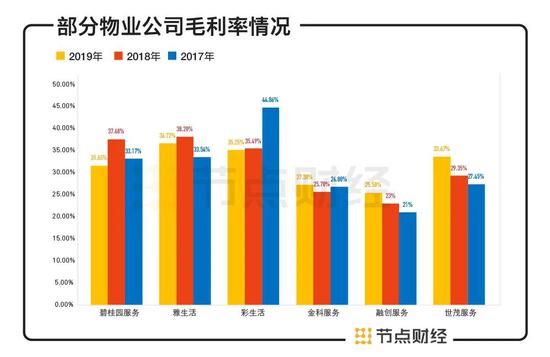 据中国物业管理协会、上海易居房地产研究院中国房地产测评中心发布的数据,截至2020年4月30日之前已经在A股、H股上市的26家内地物管公司,近三年毛利率均值分别为29.8%、29.7%、29.4%,融创服务落后8.8%、6.7%、3.9%。