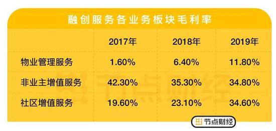 进一步分析,报告期内,核心业务也是营收占比较大的业务板块——物业管理服务,其毛利率过低或是拉低融创服务整体毛利率的诱因之一。
