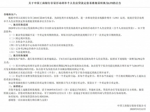 公告同时明确,批量转换完成后,若对转换结果有异议,可于2020年12月31日(含)前通过相关渠道自助转回或与贷款经办行协商处理。