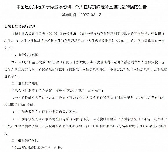 7月20日,交通银行最早公告,于2020年8月21日对尚未转换为贷款市场报价利率(LPR)或固定利率的存量浮动利率房贷,统一调整为LPR浮动利率加减点方式。