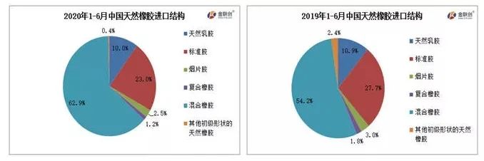 据上图,对比中国2019/2020年上半年天然橡胶进口分类数据显示,天然乳胶进口占比10%,与2019年相比变化不大;标准胶进口占比23%,下降4.7个百分点;烟片胶进口占比2.5%,微降0.5个百分点;混合橡胶进口占比约63%,增加9个百分点;其他初级形状的天然橡胶进口占比0.4%,下降2个百分点。