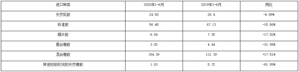具体数据分析,除混合橡胶外,其他天然橡胶进口同比均有下降。天然乳胶、标准胶、烟片胶进口同比下跌,最主要的原因是今年上半年东南亚主产区在天气、疫情等因素影响下,橡胶产量有所减少。天然乳胶因乳胶手套需求向好,泰国、马来西亚自身国内需求增加,故出口减量;欧美地区疫情严重,冲击中国轮胎出口,抑制中国买家对标胶的购买意向,据闻部分标胶长约替换为混合橡胶。其他初级形状的天然橡胶进口同比降幅高达82%,主要因2019年5月起中国海关严查混合橡胶进口,部分混合橡胶便以税号为40012900的其他初级形状的天然橡胶通关进口。