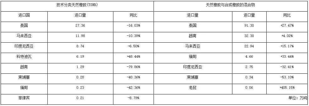 进口来源国方面,泰国、马来西亚、印度尼西亚是我国天然标胶的主要进口来源国,但2020年1-6月进口总量同比均有下滑。科特迪瓦天然橡胶进口同比增长明显,增幅约48.44%,因其价位偏低,下游轮胎企业对其认可度逐渐提升,需求有稳步增加。混合橡胶的主要进口来源国是泰国、越南和马来西亚,今年上半年进口同比均有上涨,其中越南进口胶增幅较小,仅为4.02%。