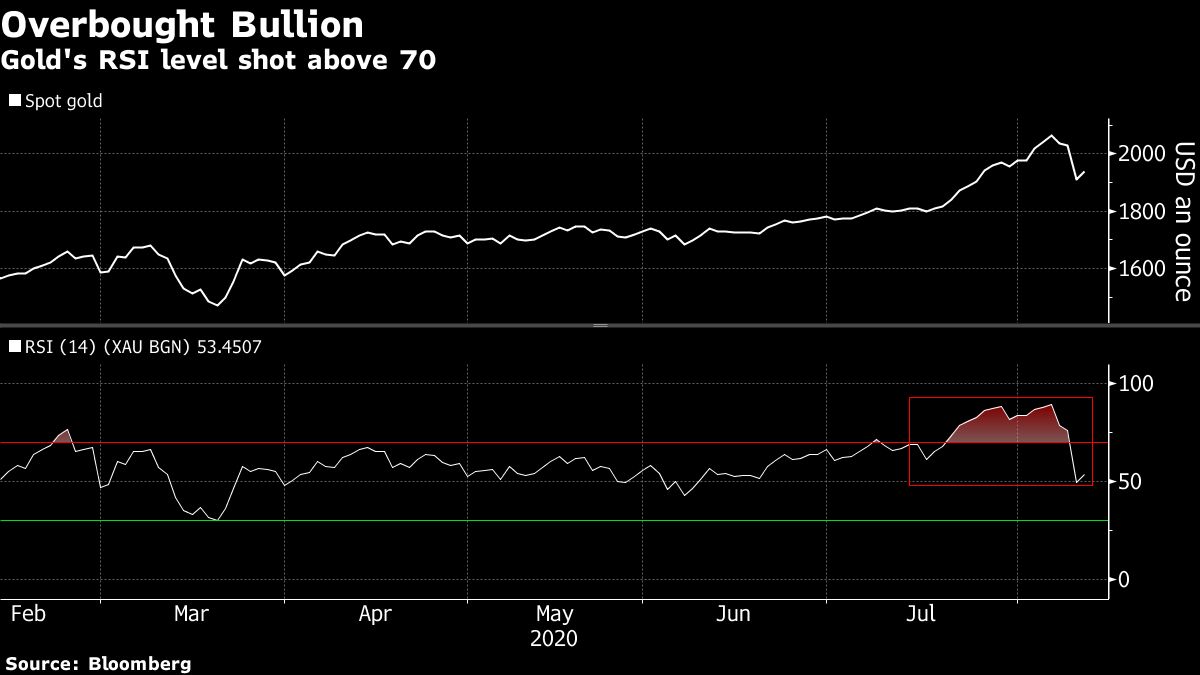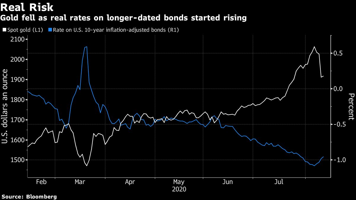 受全球刺激措施、负实际利率和美元疲软推动,今年以来黄金大涨30%以上,刷新2011年创下的前纪录高位。包括高盛和美国银行在内的一些银行预测黄金将继续攀升。但是在上周五创下每盎司超过2070美元的新高后,黄金已下跌了近10%,仅周二就创下七年来最大跌幅。