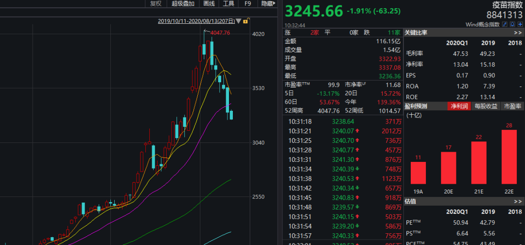 8月12日上午,A股三大股指下挫。盘面上,Wind疫苗指数全日大跌6.04%。