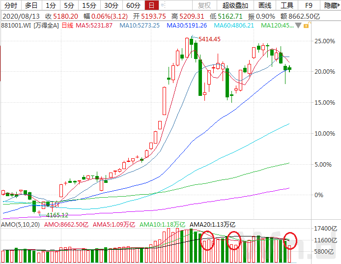 市场缩量调整,8月13日,万得全A成交金额仅8662多亿元,本轮调整首次跌破万亿关口,而从近一个多月的行情走势来看,单日成交额基本都在万亿以上,市场缩量时往往也意味着底部将近。