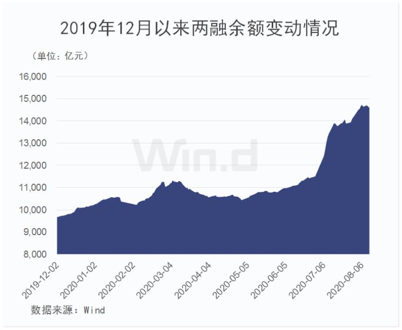 Wind数据显示,截至8月12日,A股融资融券余额为14602.6亿元,较前一交易日的14636.77亿元减少34.17亿元。而6月30日时,两融余额仅为11637.68亿元,7月以来,累计增长约3000亿元。