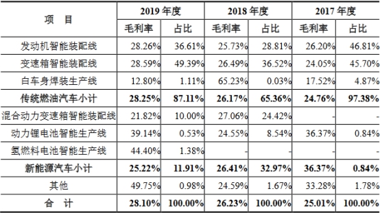 对于新能源汽车领域毛利率连续两年下滑,豪森股份解释称,应用于新能源汽车动力总成关键部件生产的智能生产线,无论是动力锂电池智能生产线还是氢燃料电池智能生产线,其销售毛利率均较高,但报告期内通过终验收确认收入项目的金额总体较小。混合动力变速箱智能装配线业务,主要为盛瑞传动八档混合动力自动变速器智能装配线项目和上汽通用GFE混合动力变速箱智能装配线项目,该业务、项目及客户对发行人来说重要性较高,属于金额和附加值均较大的整线项目,故公司中标价格相对较低,相应毛利率较低,拉低了新能源汽车领域的智能生产线整体的毛利率水平。