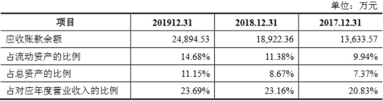 2017年年末、2018年年末和2019年年末,豪森股份应收账款余额分别为1.36亿元、1.89亿元和2.49亿元,占营业收入的比例分别为20.83%、23.16%和23.69%,占流动资产的比例分别为9.94%、11.38%和14.68%;占总资产的比例分别为7.37%、8.67%和11.15%。