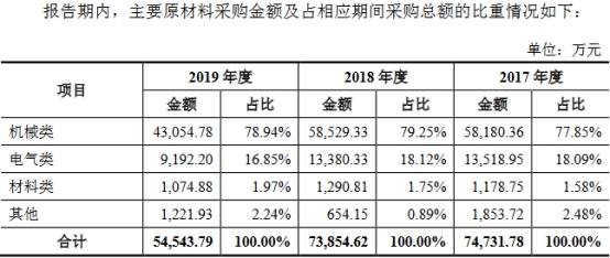 报告期内,该公司采购机械类原材料分别为5.82亿元、5.85亿元和4.31亿元,占比分别为77.85%、79.25%和78.94%;电气类原材料采购额分别为1.35亿元、1.34亿元和9192.20万元,占比分别为18.09%、18.12%和16.85%。