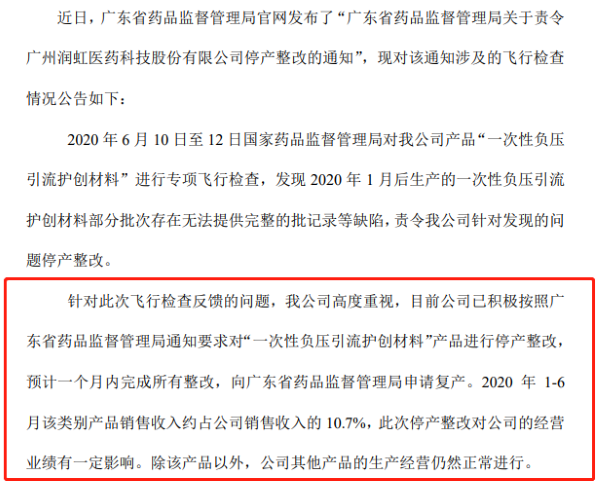 润虹医药在上述公告中称,公司已积极按照广东省药监局通知要求对“一次性负压引流护创材料”产品进行停产整改,预计一个月内完成所有整改,向广东省药监局申请复产。“2020年1-6月该类别产品销售收入约占公司销售收入的10.7%,此次停产整改对公司的经营业绩有一定影响。”