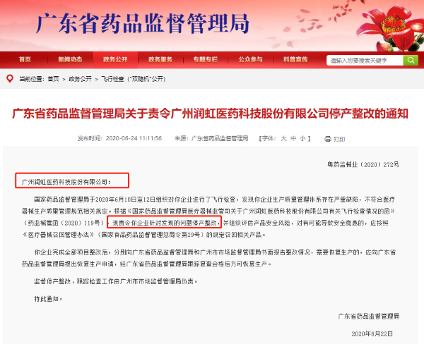 记者注意到,6月24日,润虹医药就曾因生产质量管理体系存在严重缺陷,不符合医疗器械生产质量管理规范相关规定,被广东省药监局责令停产整改。