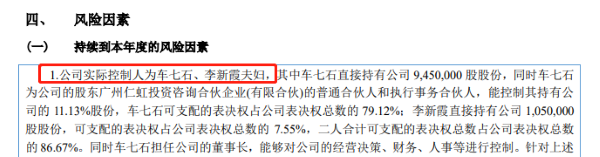 2019年年报显示,润虹医药实际控制人为车七石、李新霞夫妇,其中车七石为公司股东珠海仁励管理咨询合伙企业(有限合伙)的普通合伙人和执行事务合伙人,能控制其持有公司的11.13%股份。车七石、李新霞二人合计可支配的表决权总数占公司表决权总数的86.67%。同时车七石担任润虹医药的董事长,能对公司的经营决策、财务、人事等进行控制。