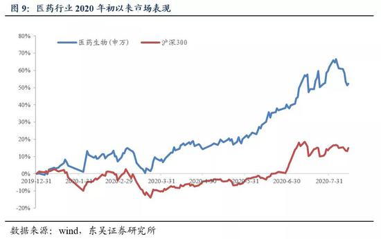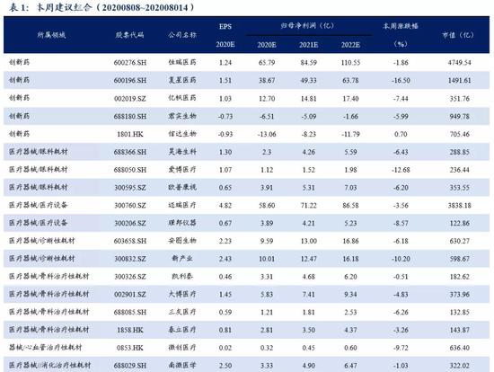 尽管近两周医药调整幅度较大,但从中长期看,医药板块超额收益确定性较大,无须过于恐慌;国内经济的内循环上升到国家战略高度,医药板块中国产占比较低子行业具有战略性大机遇,医疗器械板块机会更加明显,尤其是IVD领域的化学发光诊断性耗材、心血管心脏瓣膜(介入治疗TAVA)、骨科关节耗材、高端眼科耗材等,详情请参加东吴医药团队近日发布医疗器械研究方法深度报告。通过国际视野比较,眼科耗材是我们团队重点推荐骨科、IVD等医疗器械板块以来,出重拳又一战略性看好子行业,看好龙头昊海生科等;新冠疫苗板块是一个巨大期权,其商业模式破灭前,疫苗板块行业很难轻易结束,重点推荐智飞生物等。我们认为:除老龄化提速及药审、医保变革外,三大因素支撑医药产业中长期牛市;二大逻辑刺激医药板块8月份持续走强。