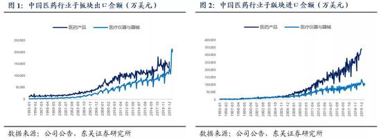 从进口额来看,2019年,中国医药产品进口金额达到357.20亿美元,同比增长21%,中国医疗仪器与器械进口金额达到124.39亿美元,同比增长11%。得益于国家实施抗肿瘤药物零关税的实施以及创新药品加快进口上市,海外医药产品进口额增长迅速,同时,受国家医保及专利到期红利等影响,国内药企加快仿制药推出速度或加强自主创新产品的研发,通过仿制药替代和创新药品上市,进一步降低原研药品价格,满足临床未被满足的需求,使更多患者受益。