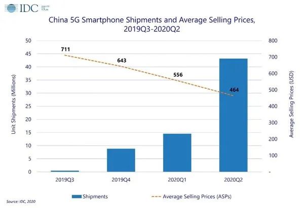 放眼全国来看,在5G智能手机出货量方面,IDC数据显示,第二季度中国市场5G手机出货量超过4300万部,约为上季度的3倍,市场占比也由第一季度的21.8%提升到近50%。此外,2019年第三季度国内上市的首批5G智能手机平均价格高达711美元,到了2020年第二季度,平均价格为464美元,降低近35%。