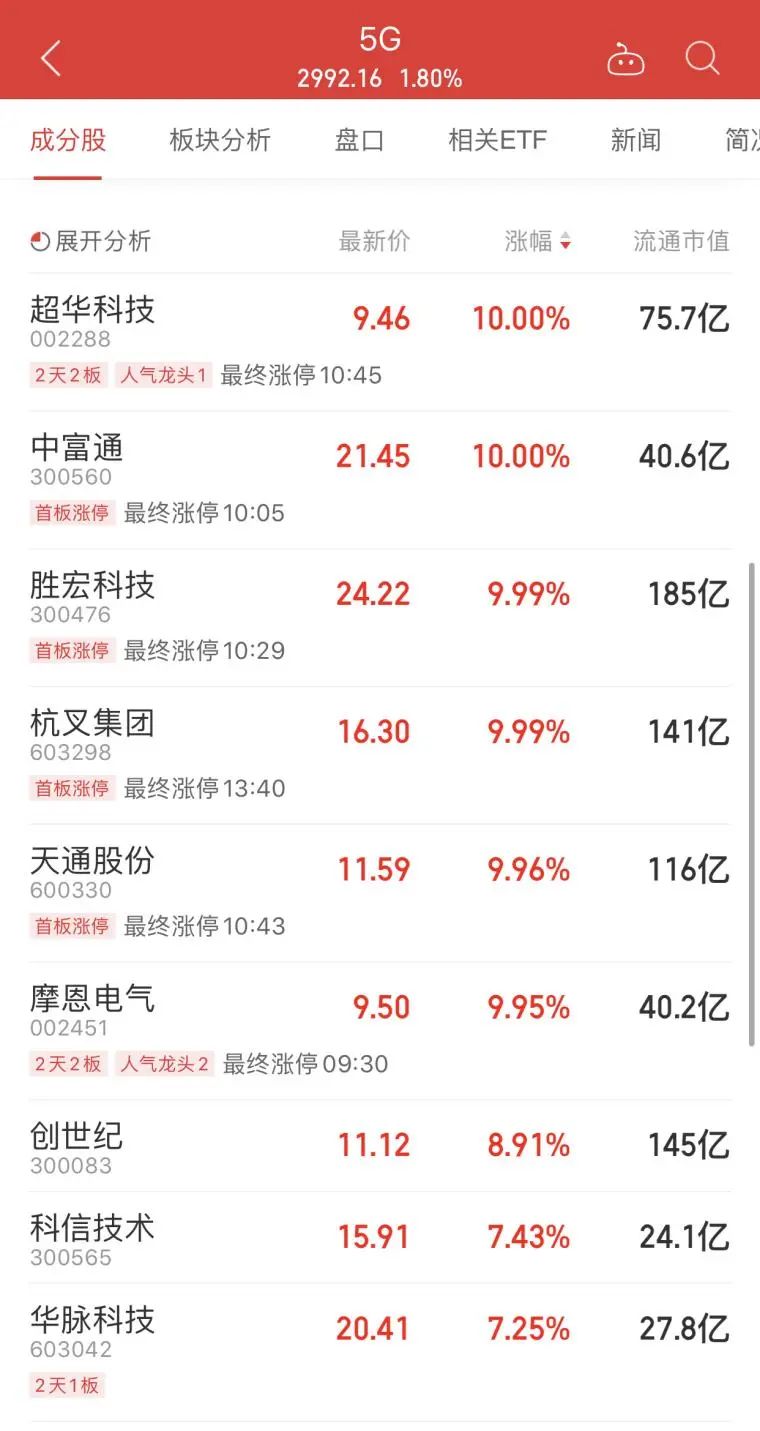今日盘面上,5G相关概念股表现抢眼,截至发稿,超华科技(维权)、中富通、胜宏科技、杭叉集团、中脉科技、天通股份、摩恩电气纷纷涨停。