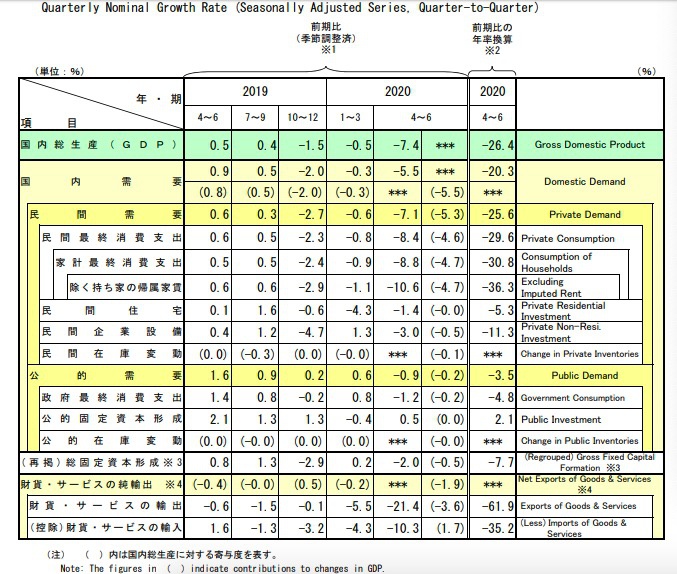 日本内阁府公布信息显示,今年4月至6月日本名义GDP也连续三季度负增长,名义GDP比上季度下滑7.4%,按年率换算下滑26.4%。
