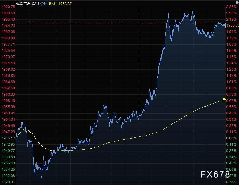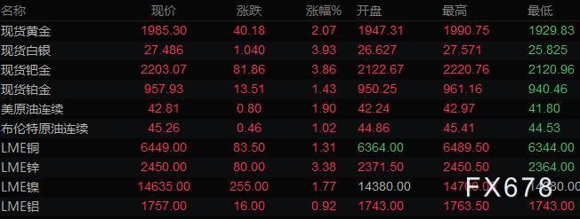 现货黄金突破关键的短期技术阻力位,刷新近一周高位,较日内低点反弹50美元,迈向1990美元/盎司。黄金已经收复上周暴跌的一半以上的跌幅。美盘时段,由于美元走软,黄金加速反弹。只要黄金维持在1965美元/盎司上方,看涨基调就可能维持不变;突破1990关口,则下一强劲阻力位可能在2015美元/盎司。