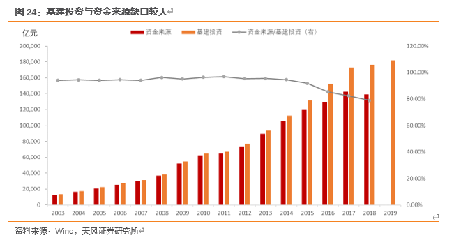 大体而言,基建资金来源可以包括以下几类:公共预算资金、政府性基金(含专项债)、银行贷款、非标(信托、委贷、租赁等)、城投债、铁道债、PPP、BT/BOT等。如果按照2012年以来的《固定资产投资统计报表制度》,四本账都属于“国家预算资金”,银行和非银贷款属于“国内贷款”。需要关注的是,基建资金来源中有60%属于“自筹资金”,考虑到基建投资整体还是由政府主导,自筹资金可能主要还是由债务融资和财政资金构成。