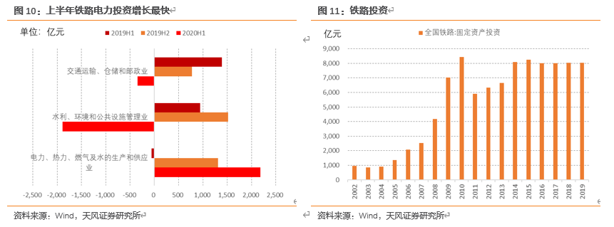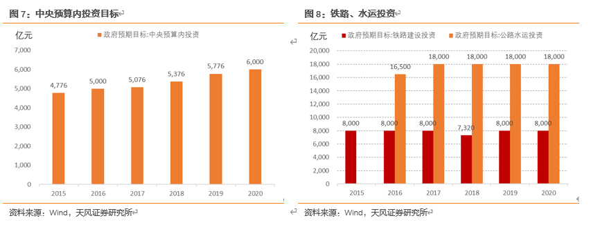 预算内投资、公路水运投资基本持平。2020年中央预算内投资安排6000亿元,仅较去年增加224亿元。政府工作报告未设铁路、公路水运投资目标。按照此前交通工作会议的部署,2020年预期目标是完成铁路投资8000亿元左右,公路水路投资1.8万亿元左右。5月19日国新办新闻发布会再次确认公路水路投资1.8万亿元的年度目标。