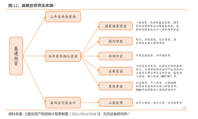 统计局的资金来源分类。按照统计局历年《固定资产投资统计报表制度》,本年基建投资资金来源包括上年末结余资金、本年实际到位资金,上年末结余资金规模较小,通常关注本年实际到位资金。本年实际到位资金包括国家预算资金、国内贷款、债券、利用外资、自筹资金和其他资金,其中债券(企业债、公司债、中票等)自2006年起纳入其他资金统计。由于政府收支科目变化,固定资产投资资金来源统计亦经历过口径调整。目前财政四本账(含政府债券)均属于国家预算资金,根据定义社融非标(委托贷款、信托贷款)也属于国内贷款。