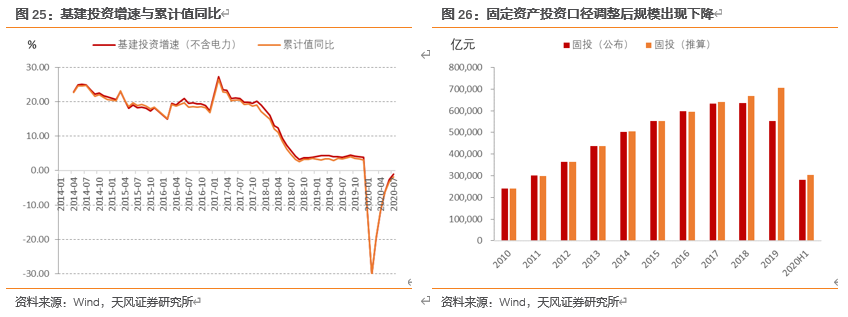 由于2017年之后统计局不再公布行业固定资产投资绝对数,通常的做法是以2017年的绝对数为基础,根据同比增速得到之后的各行业投资累计值,然后加总求得相应的基建旧口径增速。由于口径调整对各行业都有涉及,而且统计局公布的同比增速按可比口径计算,因而按上述方法推算求得的基建增速,和公布值差别并不大。因而2018、2019年基建增速较低,固定资产投资口径调整的影响并不大。