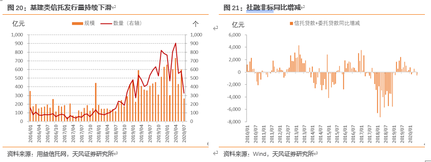 非标继续压降。2019年监管对信托行业进行三次风险排查,重点是“去通道控地产”。今年虽然面临疫情冲击,但监管治理影子银行的决心并未动摇。3月证券时报报道,监管部门要求2020年压降1万亿具有影子银行特征的融资类信托业务 ,5月信托新规征求意见稿对信托公司非标比例和集中度都施加了严格限制,6月24日银保监发〔2020〕27号文再度强调融资类信托监管。此外,资管新规延期一年但实际上监管标准并未放松,而且有明确的处罚措施。虽然上半年社融信托贷款+委托贷款降幅收窄,考虑到年底信托到期量大,预计非标融资较去年还是会继续减少。