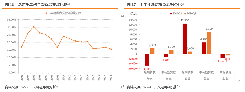 按照全年新增贷款20万亿,下半年新增贷款8万亿左右,略高于去年同期。上半年新增贷款增量贡献主要来自企业贷款,短期贷款和中长期贷款均多增约1.3万亿;下半年信用扩张放缓预计也会使基建贷款有所降温。