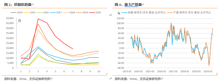 基建快速升温在相关数据上亦有体现。基建投资带动建筑业景气度回升,建筑钢材成交量持续高于往年水平,挖掘机、重卡销量大幅增长。从建筑业订单来看,疫情之后新签合同金额快速恢复,特别是基建合同增长最快。