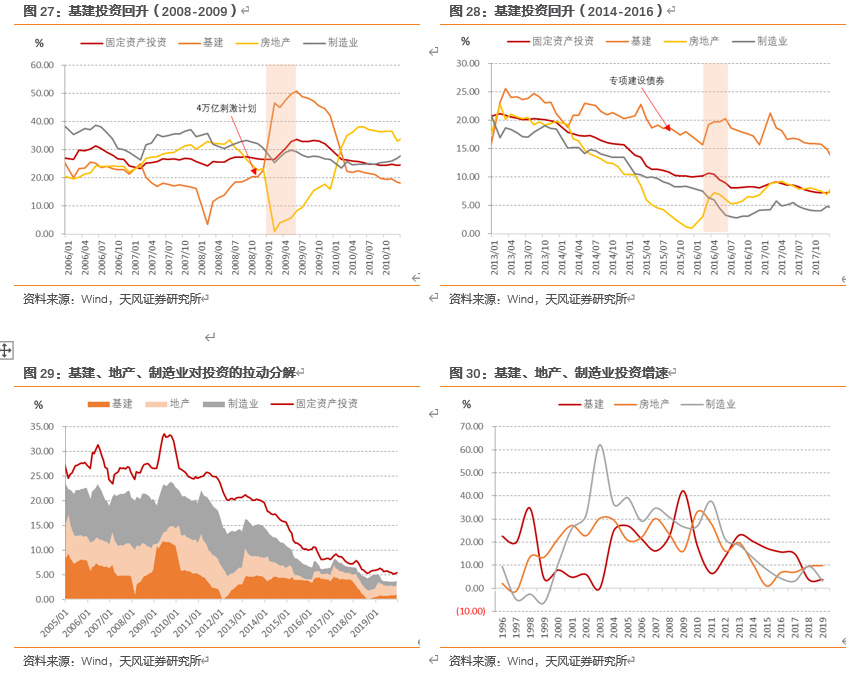 因而,我们可以看到,每一轮稳增长过程中往往是基建率先发力稳住基本盘,然后随着地产市场回暖基建投资力度相应减弱,经济随之正式企稳。当然在此过程中消费和外贸也会有不同程度回暖,但毫无疑问房地产是其中重要一环。可以看到,2009年、2016年的两轮经济企稳都符合这一规律。