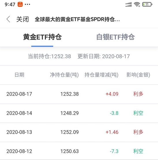 热点栏目全球最大黄金ETF--SPDR Gold Trust持仓较上日增加4.09吨,当前持仓量为1252.38吨。上周黄金经历大规模抛售,目前已重新反弹,隔夜金价大涨近60美元,再度逼近2000美元关口。