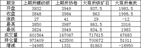 今日国内黑色系延续高位震荡走势,除焦炭未能成功守住涨势,其它全线飘红。尤其铁矿石强势强劲,涨幅达到3%以上。期螺又是一个横盘震荡的走势,盘中一度回落,尾盘再度拉起,总体仍然没有脱离区间盘整的步调。
