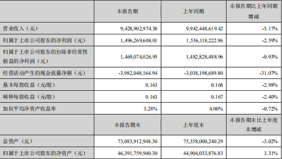 2020年一季度,公司营业收入为94.29亿元,同比下降5.17%;净利润为14.96亿元,同比下降2.59%。