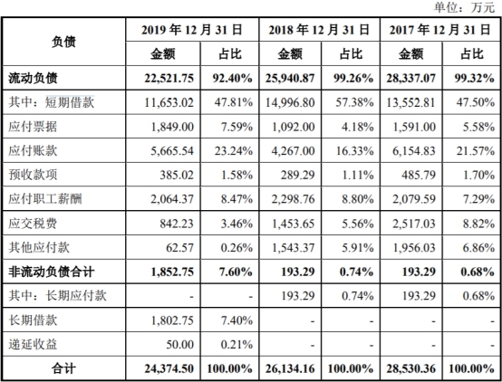 2016年末至2019年末,兆龙互连负债合计1.71亿元、2.85亿元、2.61亿元、2.44亿元。其中,短期借款分别为5921.00万元、1.36亿元、1.50亿元、1.17亿元,均为银行借款。