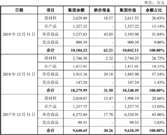 2017年末、2018年末以及2019年末,公司原材料以及库存商品计提了跌价准备分别为30.26万元、31.50万元以及62.21万元,主要原因在于少部分存货库龄相对较长,其可变现净值低于账面价值所致。