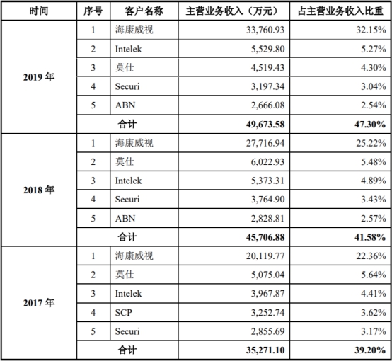报告期内,兆龙互连主营业务前五大客户销售收入占比不断提升。2016年度、2017年度、2018年度、2019年度,公司主营业务前五大客户的销售收入分别占当年主营业务收入的29.68%、39.20%、41.58%以及47.30%;其中,对第一大客户海康威视的销售收入占主营业务收入比重分别为11.09%、22.36%、25.22%、32.15%。