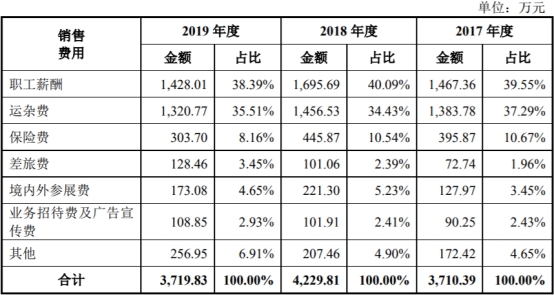 2016年至2019年,兆龙互连的销售费用分别为3470.05万元、3710.39万元、4229.81万元以及3719.83万元。兆龙互连销售费用主要由职工薪酬以及运杂费构成,合计占销售费用的比重分别为81.17%、76.84%、74.52%以及73.90%。
