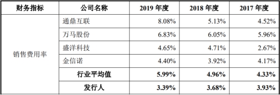 兆龙互连的销售费用率逐年下降。2016年至2019年,兆龙互连的销售费用率分别为4.88%、3.93%、3.68%、3.39%,与同行业可比上市公司平均值分别为4.72%、4.33%、4.96%、5.99%。