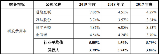 兆龙互连的研发费用率低于行业平均水平。2016年至2019年,兆龙互连的研发费用率分别为3.42%、3.84%、3.74%、3.79%,同行业可比上市公司平均值分别为3.87%、3.79%、4.59%、5.05%。