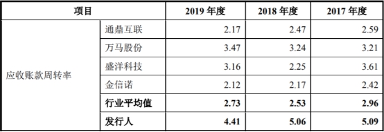 兆龙互连的应收账款周转率同行业上市公司。2016年至2019年,行业平均值分别为2.83、2.96、2.53、2.73。