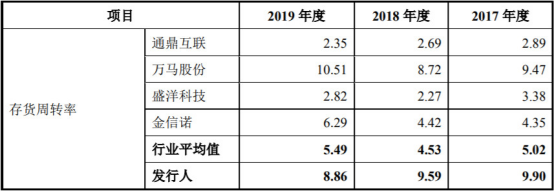 兆龙互连的存货周转率逐年下滑。2016年至2019年,兆龙互连的存货周转率分别为11.62、9.90、9.59、8.86,同行业上市公司平均分别为5.20、5.02、4.53、5.49。